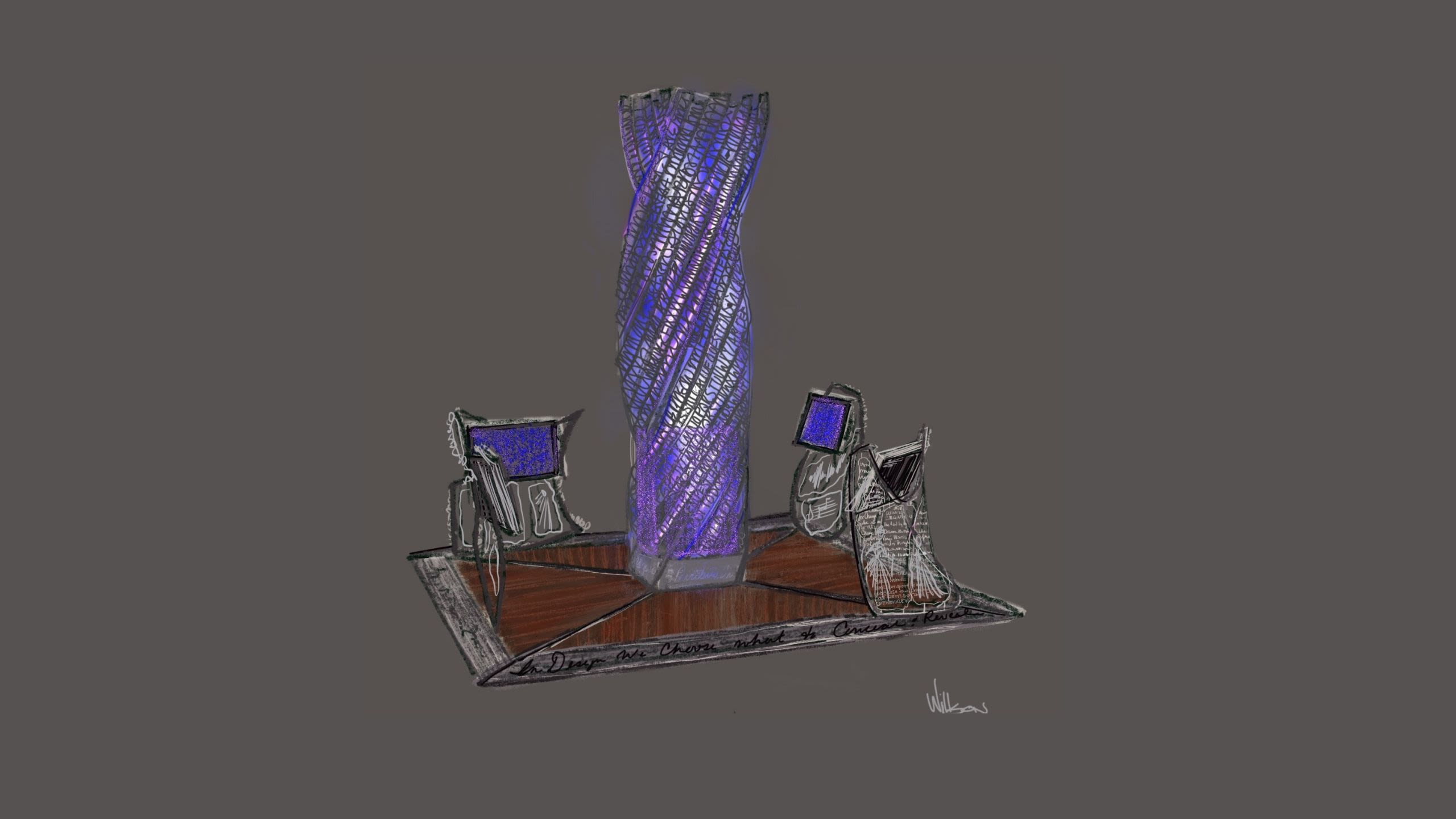 In the center of the exhibit stands a 16-foot tall cylindrical column wrapped with quotations from American designers and the following words: