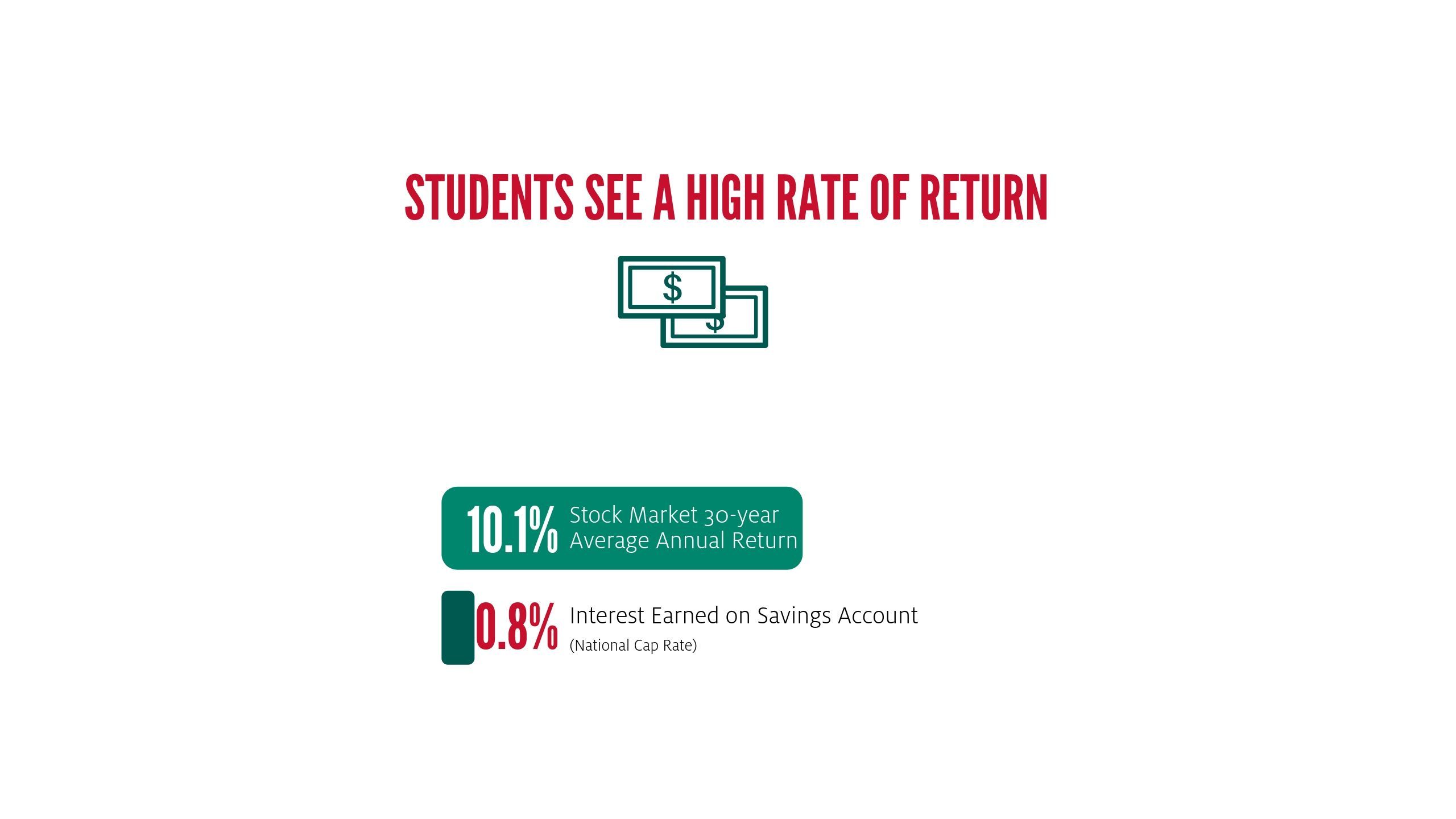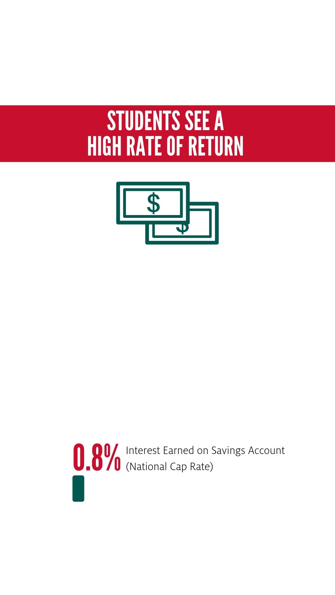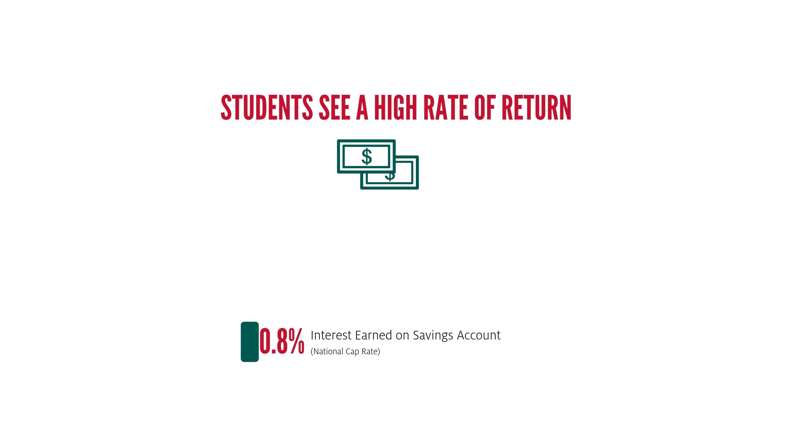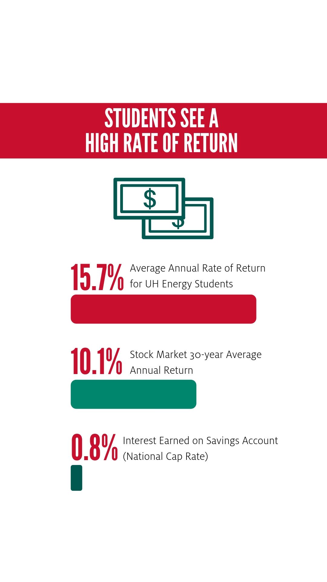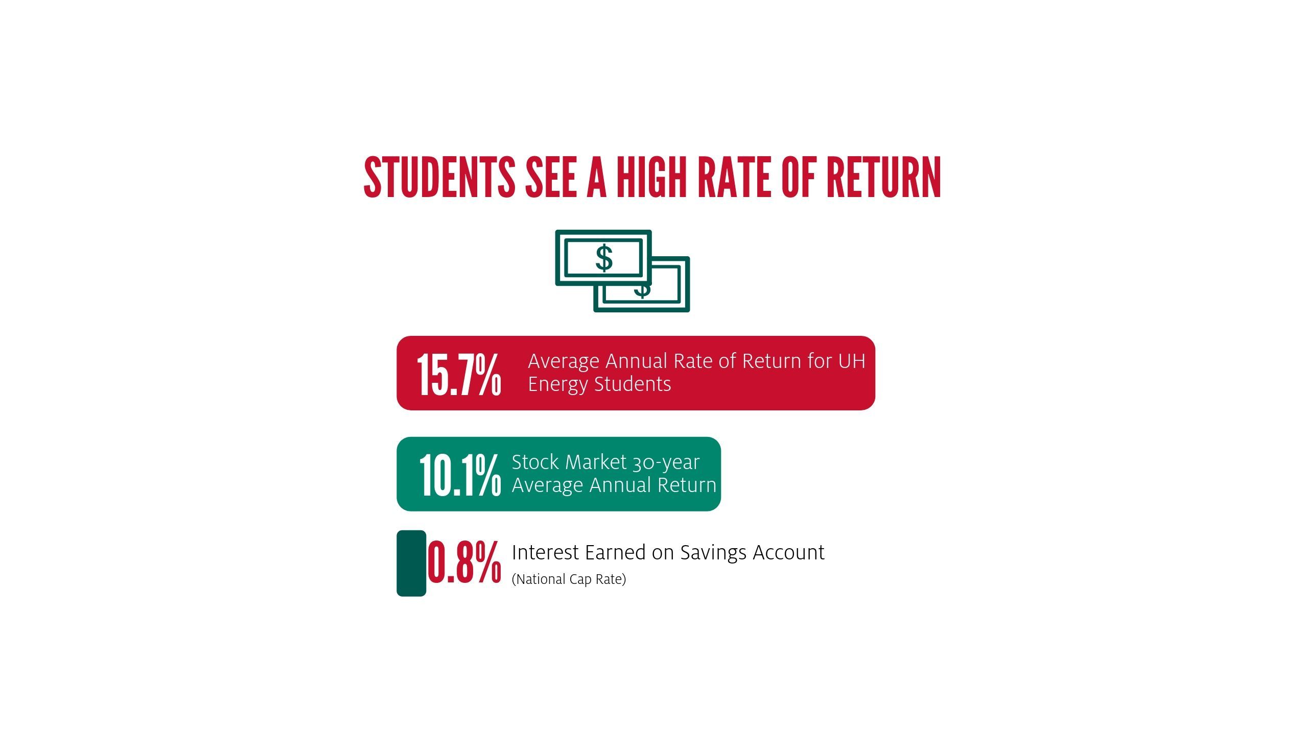 When compared to alternative investments, the annual rate of return for earning a degree in a UH Energy field of study is 5.6% greater than average stock market returns over the past 30 years (15.7% and 10.1% respectively) and far exceeds any interest they would have earned from a savings account (o.8%).