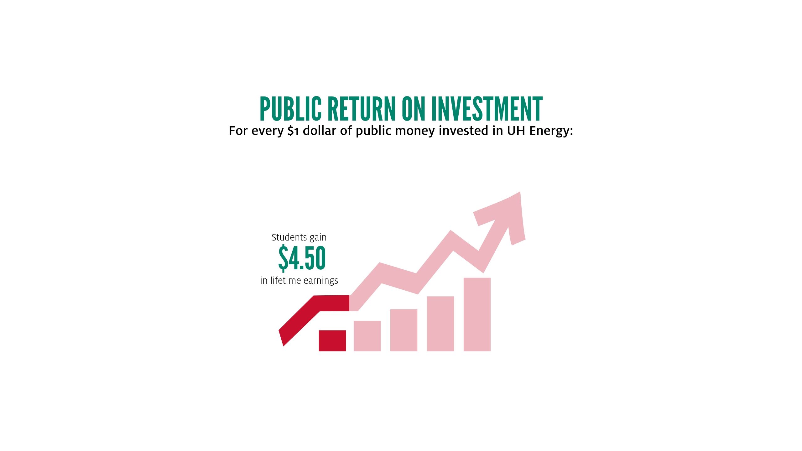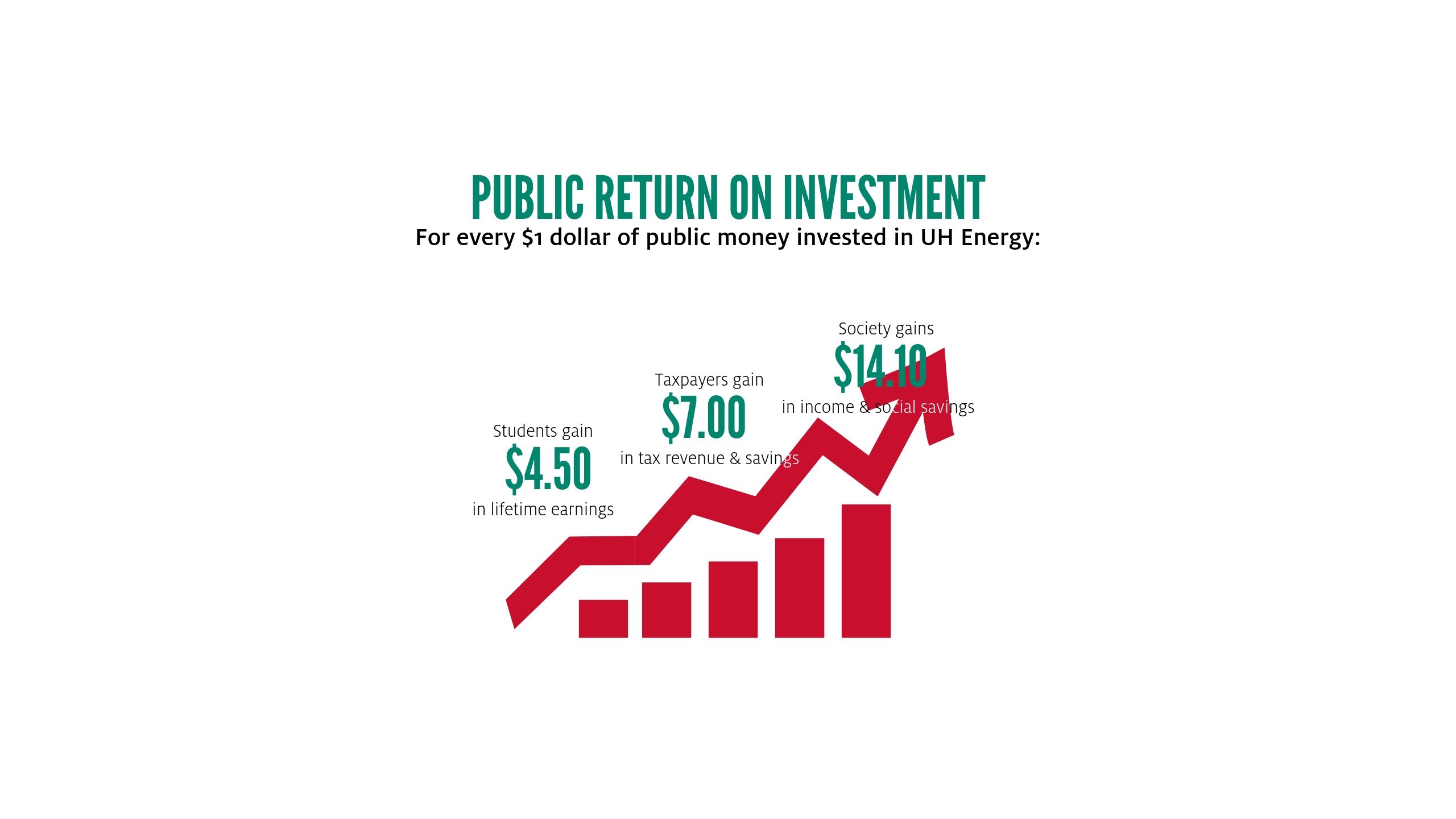 Students are not the only winners. For every $1 of public money invested in UH Energy, taxpayers will receive a cumulative value of $7 over the course of students' working lives. The average annual rate of return for taxpayers is 15.6%.